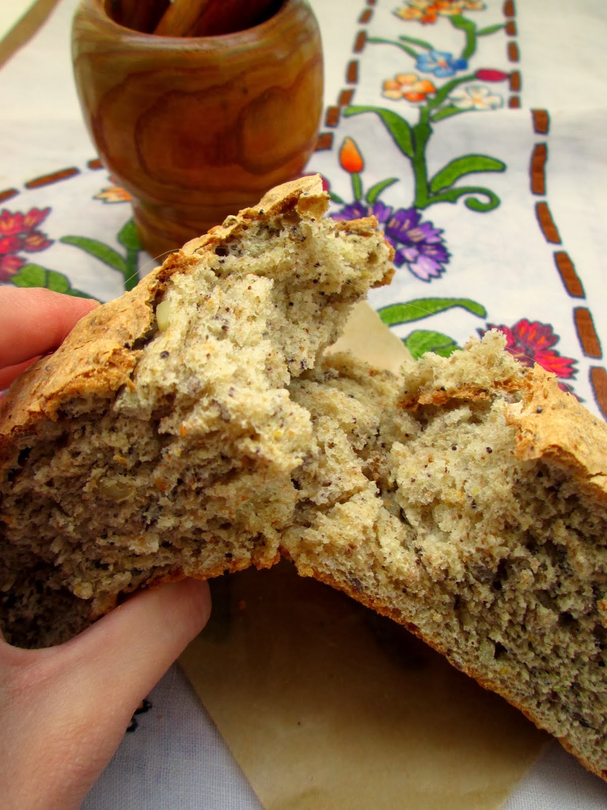 U mlaku vodu sa šećerom stavite kvasac i pustite da naraste. U drugoj posudi pomešajte sve vrste brašna sa ostalim sastojcima, dodajte vodu sa kvascem i umesite testo. Biće malo gnjetavo :-) nemojte da natirete brašnom i izlupajte ga varjačom koliko vam snaga dozvoljava :-). Ostavite da naraste na toplom da mu se zapremina udvostruči. Podmažite kalup u kom ćete da pečete hleb ali možete to da učinite i na papiru za pečenje. Nema potrebe da se testo premesi, samo ga prebacite u pleh.